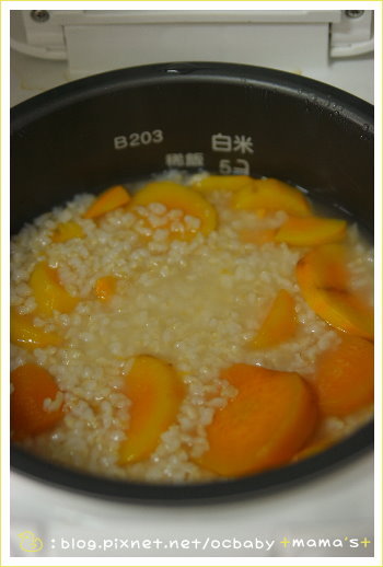 糙米洗好.蕃薯切好就全丟到飯鍋裡煮 因為糙米比較難爛透 所以我會再燜個三小時