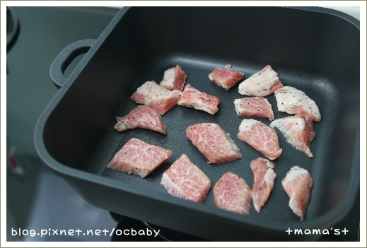 家長愛吃的這種豬肉挺肥的了 所以就不下油 放在不沾鍋裡煎
