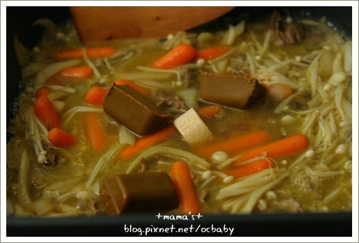 加了水後 放三塊咖哩塊和半塊雞湯塊