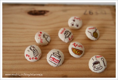 簡單的幾個顏色和圖案..做成包扣後再做成磁鐵..黏在木框的小白板上..