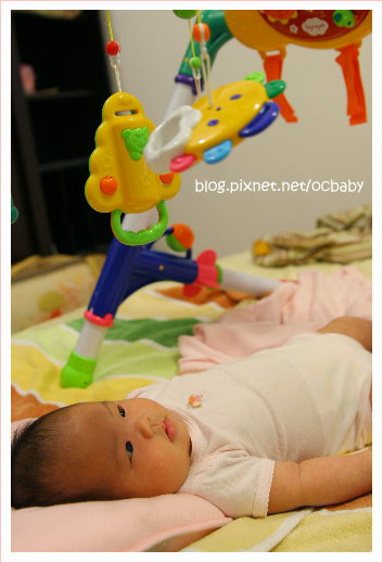 上禮拜把之前小鴨還不懂得好玩之處的音樂鈴擺在她正上方